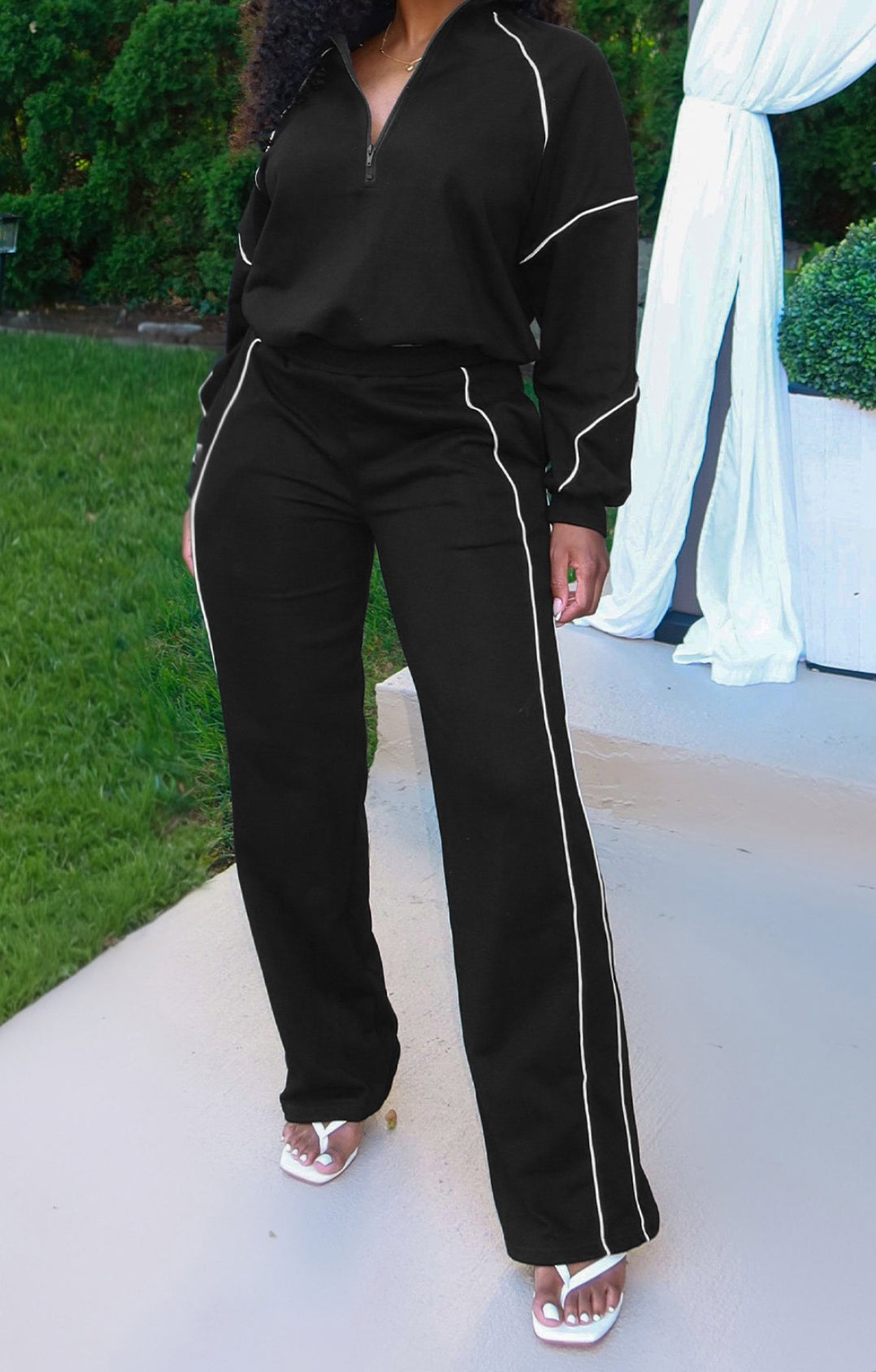 Effortless meets elevated. This sleek two-piece set features a relaxed half-zip pullover with chic contrast piping and matching wide-leg pants for a polished, elongated silhouette. Perfect for travel days, brunch, or casual nights out when you want comfort without sacrificing style.