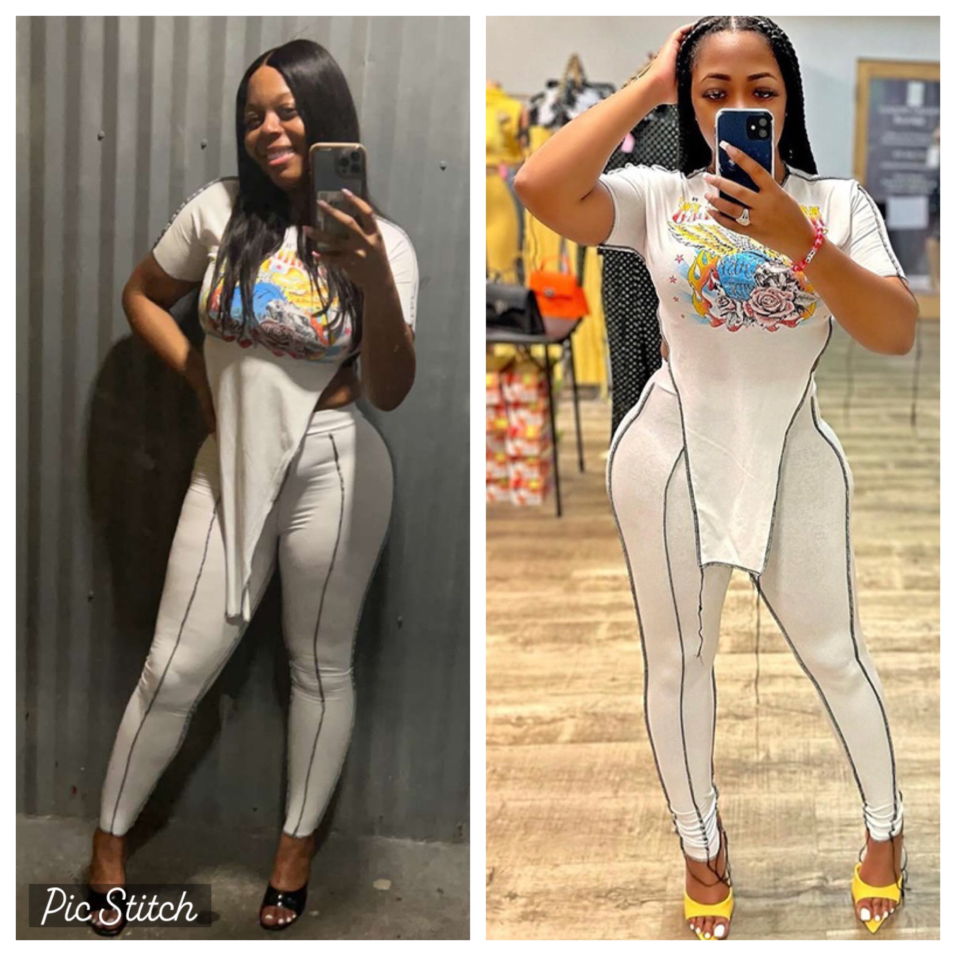 The Graphic Flow Legging Set features a printed oversized tee with asymmetrical side splits and matching fitted leggings with contrast piping details. Stretchy, comfortable, and easy to dress up or down.